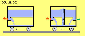 To sum up these considerations to the pros and cons of the bowl-engines, the results are sketched at picture 05.18.04. At first view is seems impossible, the pressure-relations within a closed system could affect external motions. The simple model of the reaction-effect (A) clearly approves, thrust is affecting at this car, even the water pressures affects pressure of different strength only at the inner side of the walls. However, this (like each) application of pressure is relative ineffective. Here for example, the water must be pumped up for a continuous process.