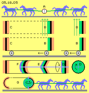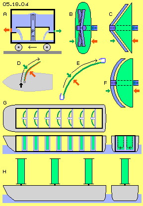 That ship with it´s fuselage filled up with sails (G) remembers a sailing ship, which - instead of normal sails - had mounted rotating round cylinders (H). These ´Flettner-Cylinders´ were most effective, e.g. a huge cargo-ship with an engine of only %0 HP did cross the Atlantic in 1926. However the times of freight-sail-ships were past, so that invention did fall into oblivion. If now however, that technology could be applied also within a closed system, quite new possibilities would result - like discussed at the following chapter ´Flettner-Box´.